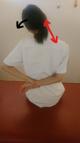 ぐーーっと下に引っ張ります。すると首の後ろが伸びるのが確認できると思います。