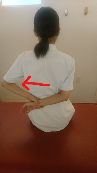 この場合は、手を後ろで組んで伸ばし、腕を上げて胸を反らせるイメージです。
